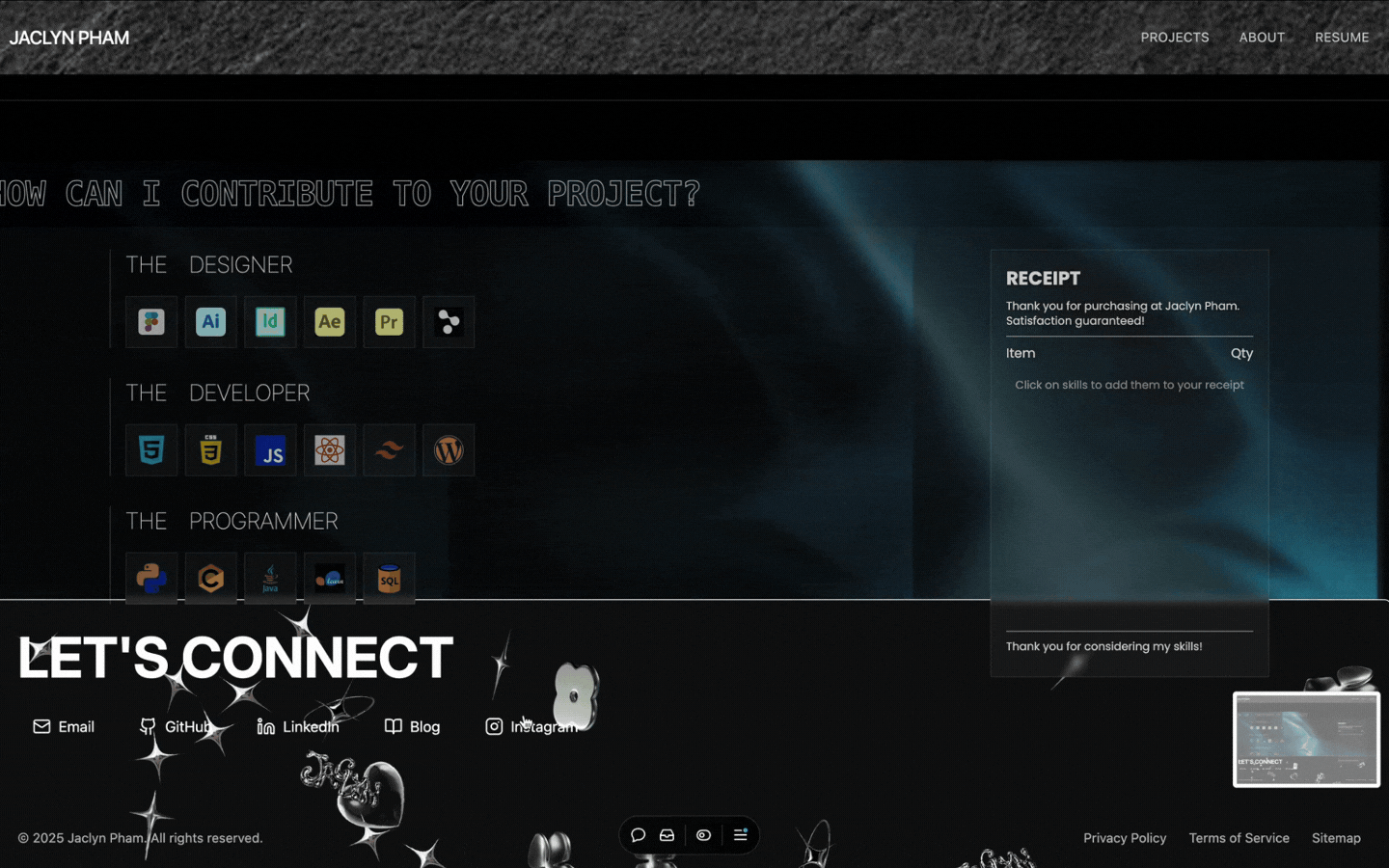 I’m Jaclyn, a designer-engineer who builds ideas into experiences you can see, touch, and feel. My philosophy is simple: a touch can tell an unspoken story, and the best work connects with people in unexpected ways.