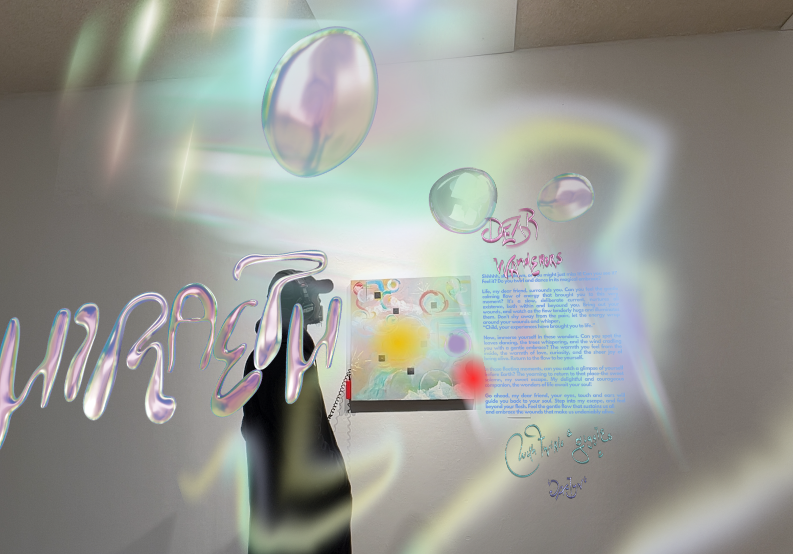 The AR Experience: Visual elements of the painting were extended into a digital space via Adobe Aero. A tablet displayed dynamic AR overlays, while QR codes allowed visitors to explore an expanded narrative of the artwork on their own devices.