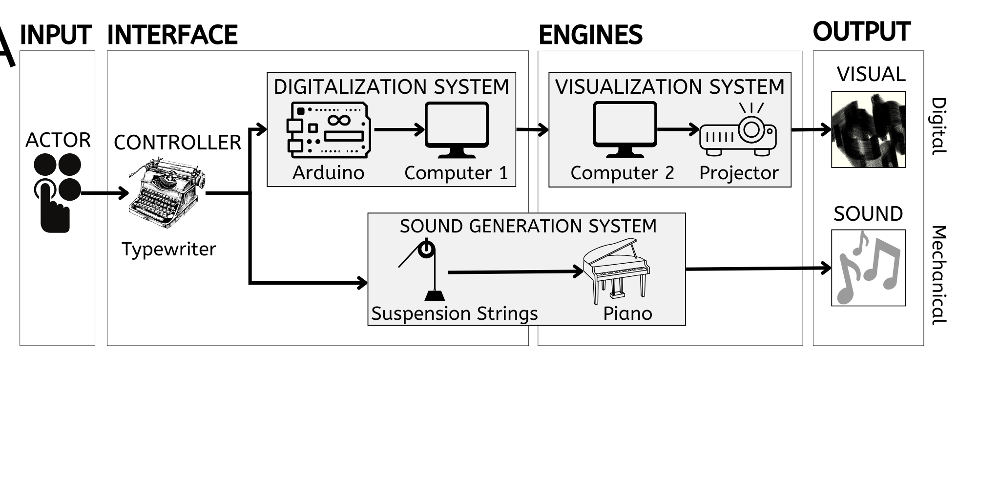 An integrated typewriter that combines analog and digital elements, allowing users to draw brushstroke on a digital canvas by pressing the keys